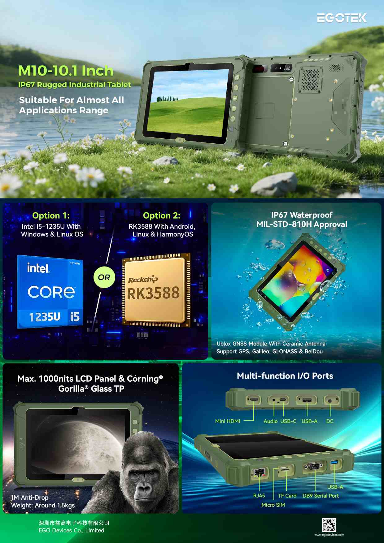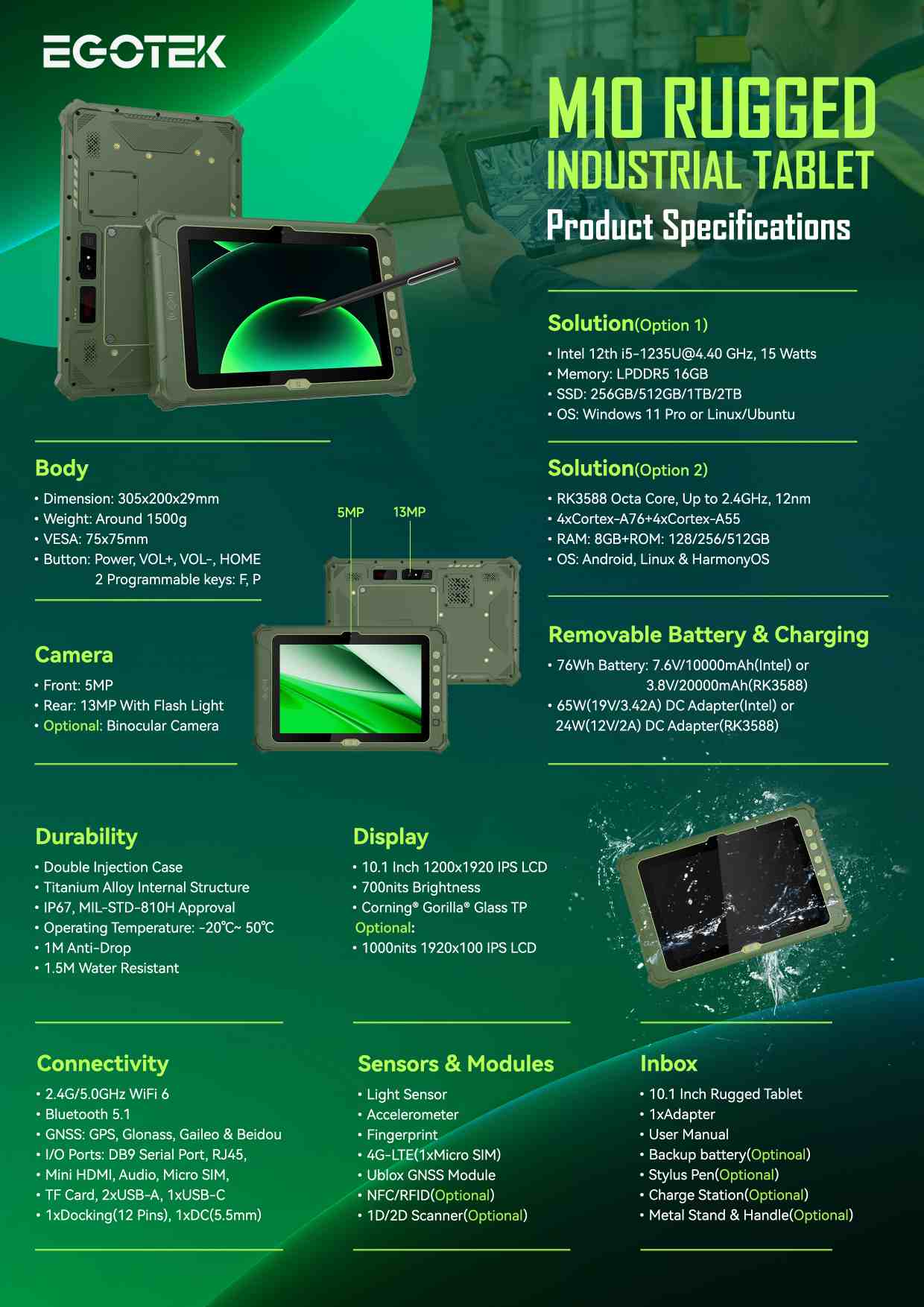 M10 10.1 Inch IP67 Rugged Industrial Tablet with MIL-STD-810H approval, powered by Intel i5-1235U (Windows 11 Pro/Linux OS) or RK3588 (Android/Linux/Harmony OS). Features 1200x1920 IPS LCD, up to 1000nits brightness, Corning Gorilla Glass, 76Wh removable battery, 4G LTE, Ublox GNSS (GPS/Glonass/Galileo/Beidou), RJ45, DB9 serial port, Mini HDMI, USB-C, 1M anti-drop protection.
